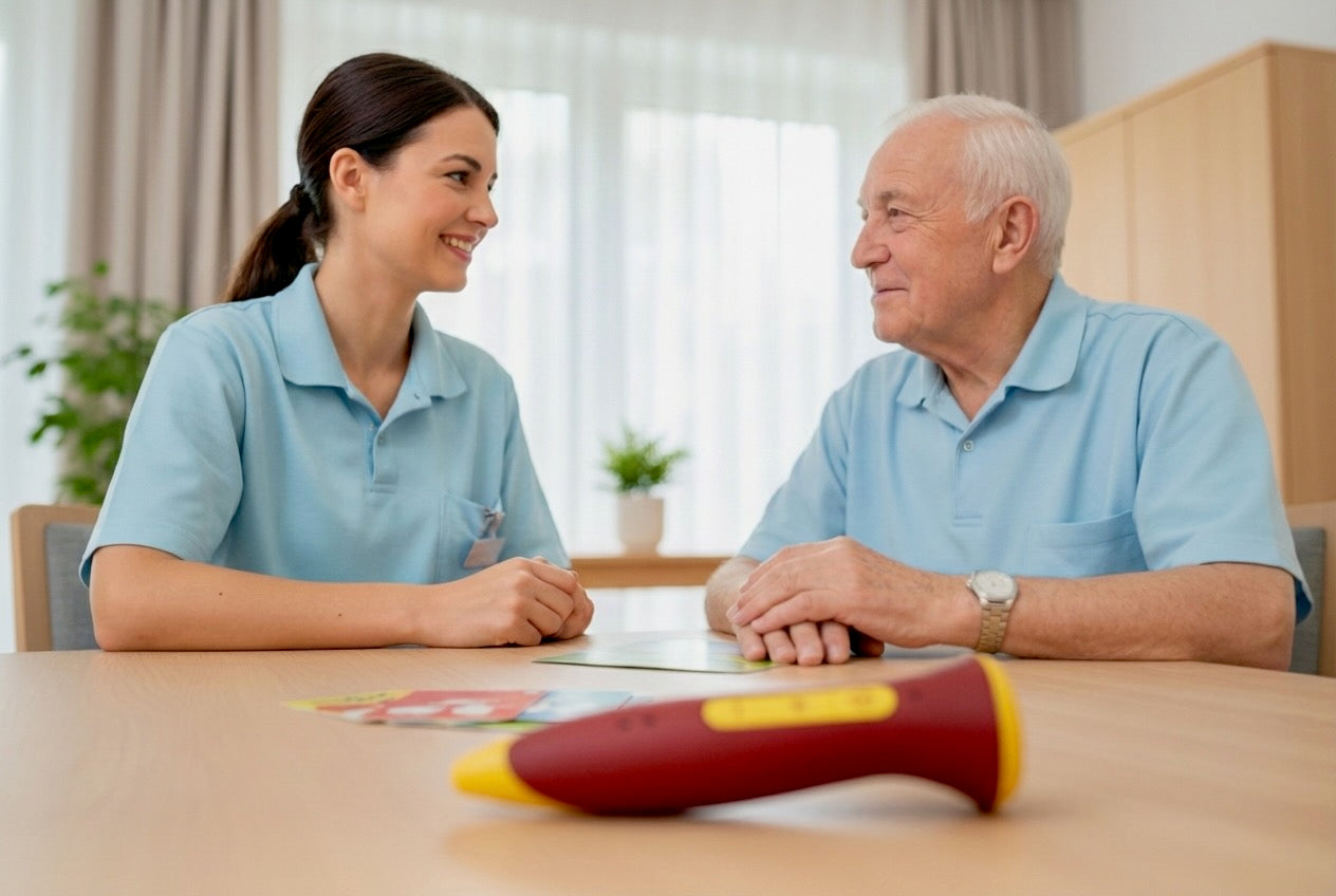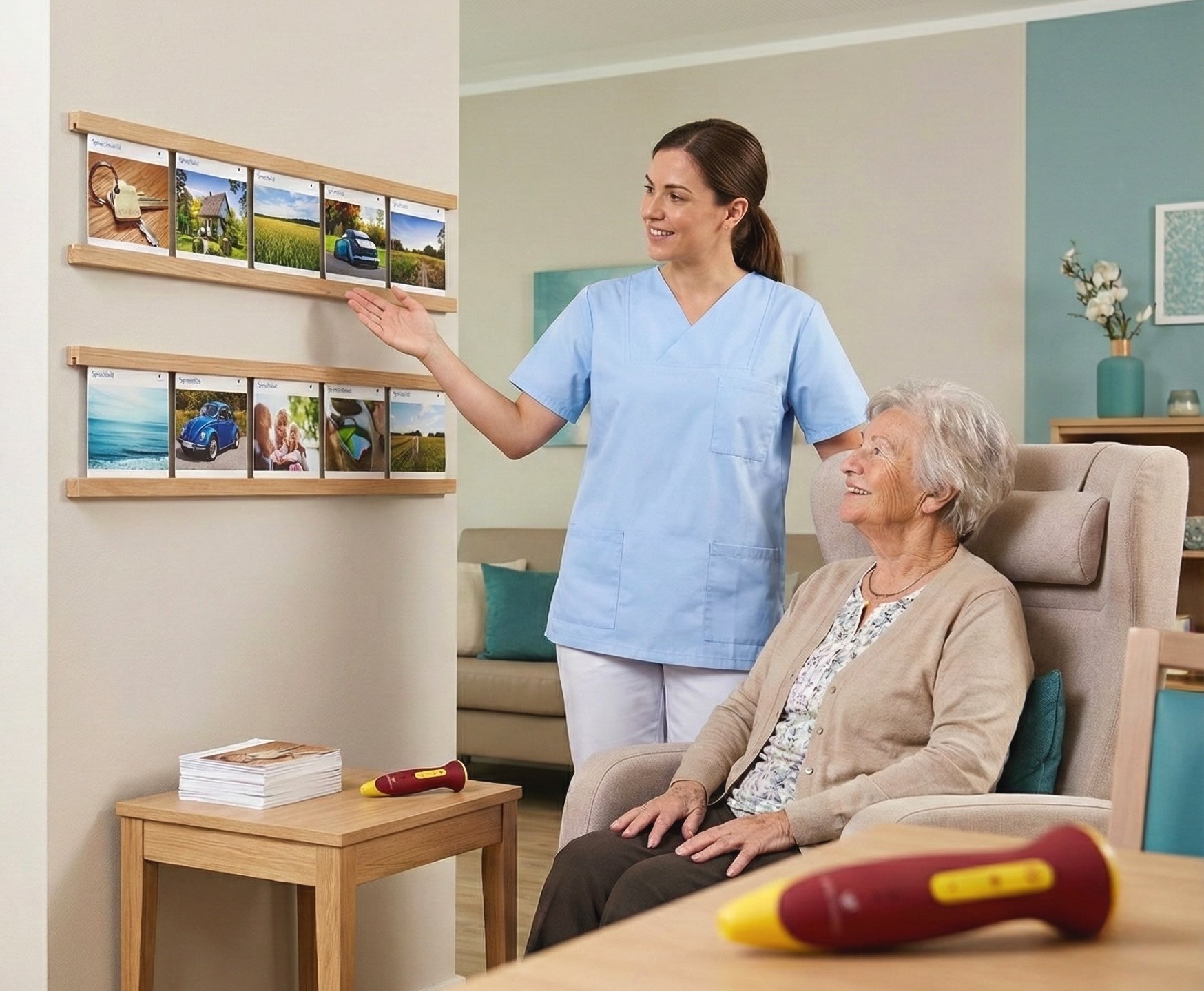 Sprechbild ist ein professionelles Arbeitsmittel für die Pflege. Ein vorkonfektioniertes Assistenzsystem, das ohne Vorbereitung eingesetzt werden kann.